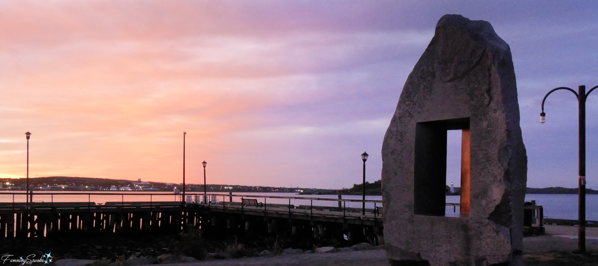 The sculpture, titled Passage, features a dramatic window which draws the viewer in to look through to the view beyond.  “Vassili spent four weeks carving and polishing a curved passageway through the top boulder …  the opening frames a view to the east, to Georges Island, the Atlantic Ocean, and the world beyond Halifax Harbour” reports the NSCAD University website in their article Passage – A Tribute to Anna.  “Timed right, a viewer could watch the morning sun rise through the opening—symbolizing a new start for many in a new home.  ‘To me, this makes sense for Halifax, which has traditionally been a gateway for many immigrants to Canada from around the world,’ says Vassili. ‘I wanted to create a space which can function as a window to connect to the other side.
